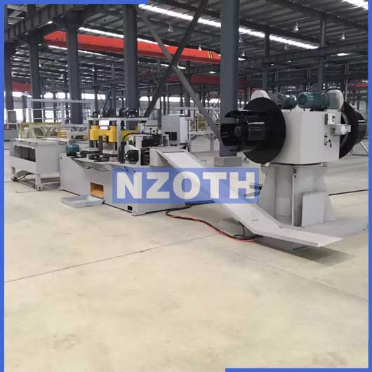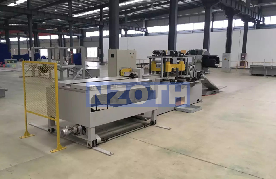 本設備由雙軸開料機,編碼器,送料裝置,滾珠螺桿導向裝置,一臺沖孔機,二臺V沖剪切裝置,料片傳送裝置,承料臺,電源系統(tǒng)等組成。